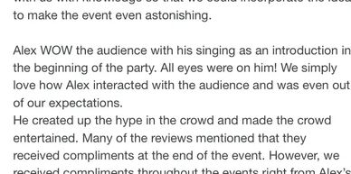 He created up the hype in the crowd and made the crowd entertained. Many of the reviews mentioned that they received compliments at the end of the event. However, we received compliments throughout the events right from Alex's introduction. They had never seen such TALENTED EMCEE and looking forward to having him again.