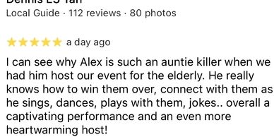I can see why Alex is such an auntie killer when we had him host our event for the elderly. He really knows how to win them over, connect with them as he sings, dances, plays with them, jokes... overall a captivating performance and an even more heartwarming host!
