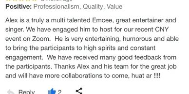 Alex is a truly a multi talented Emcee, great entertainer and singer. We have engaged him to host for our recent CNY event on Zoom. He is very entertaining, humorous and able to bring the participants to high spirits and constant engagement. We have received many good feedback from the participants. Thanks Alex and his team for the great job and will have more collaborations to come, huat ar!!!!
