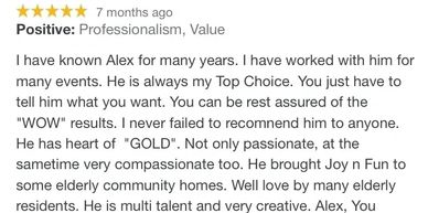 He has heart of "GOLD". Not only passionate, at the sametime very compassionate too. He brought Joy n Fun to some elderly community homes. Well love by many elderly residents. He is multi talent and very creative. Alex, You always have my support