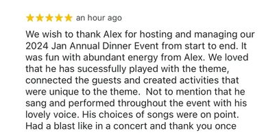 2024 Jan Annual Dinner Event from start to end. It was fun with abundant energy from Alex. We loved that he has sucessfully played with the theme, connected the guests and created activities that were unique to the theme. Not to mention that he sang and performed throughout the event with his lovely voice. His choices of songs were on point.