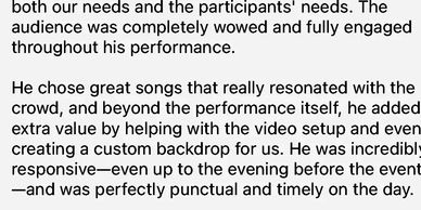 He chose great songs that really resonated with the crowd, and beyond the performance itself, he added extra value by helping with the video setup and even creating a custom backdrop for us. He was incredibl responsive-even up to the evening before the event